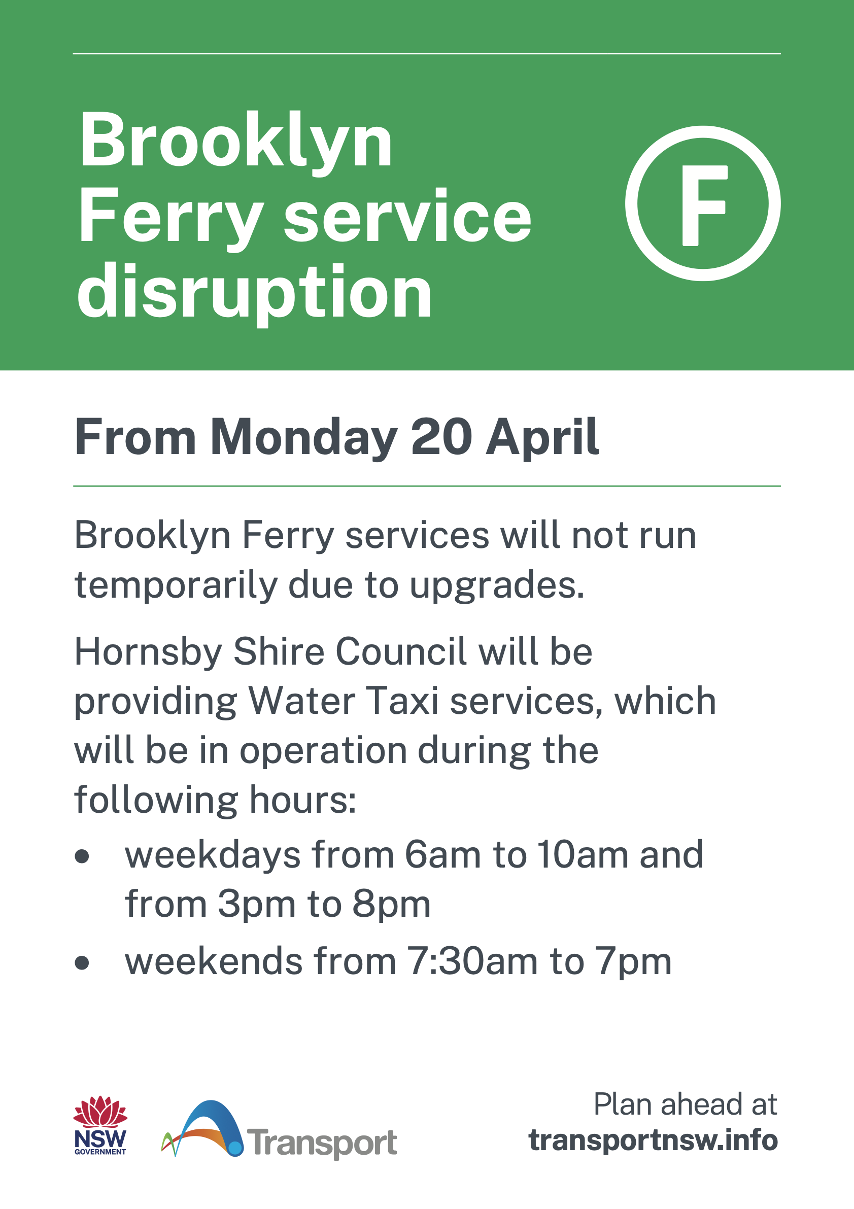Brooklyn Ferry Service is now part of the NSW Transport OPAL Network, we no longer sell tickets or accept cash payments, all passengers must travel with a valid OPAL Card, or use a credit / debit card, to Tap their fares at the Opal Tower located at Brooklyn Public Wharf, fares are by a single tap payment, tapping off at Dangar or Wobby is not necessary.